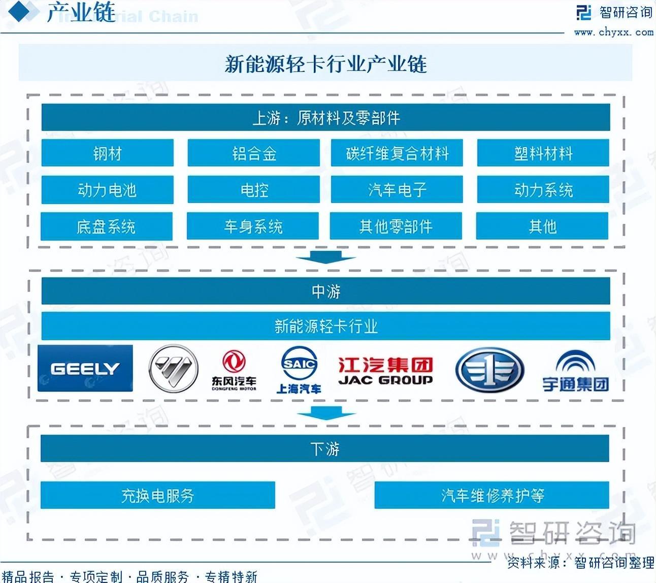 新能源轻卡产业链上游为原材料和零部件,包括钢材、铝合金、碳纤维复合材料、塑料材料、动力电池、电机、电控、汽车电子、动力系统、底盘系统、车身系统等。产业链中游为新能源轻卡的生产制造环节。产业链下游为新能源轻卡服务,包括充换电服务和汽车维修养护。