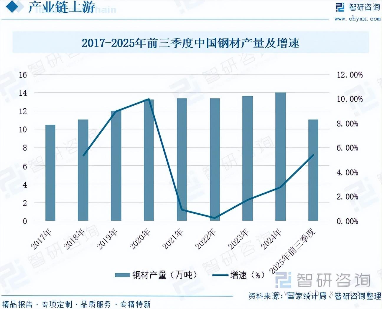 钢材作为新能源轻卡的核心原材料,主要应用于车架、底盘等承载结构件以及车身覆盖件的制造,为车辆提供必要的结构强度和承载能力,同时电池包壳体等关键安全防护部件也依赖高强度钢材来确保整体安全性与可靠性。近年来,随着工业生产稳步回升,国内制造业用钢需求上升,我国钢材产量持续攀升,呈现出显著扩大趋势。自2017年以来,中国钢材产量显著增长,到2024年钢材产量已接近14亿吨,较2017年增长了三分之一。进入2025年后,全国钢材产量更是再创新高,前三季度,钢材产量达11.04万吨,同比增长5.4%。未来,随着钢材产量的持续增长,将为新能源轻卡的大规模制造提供稳定可靠的原料保障。