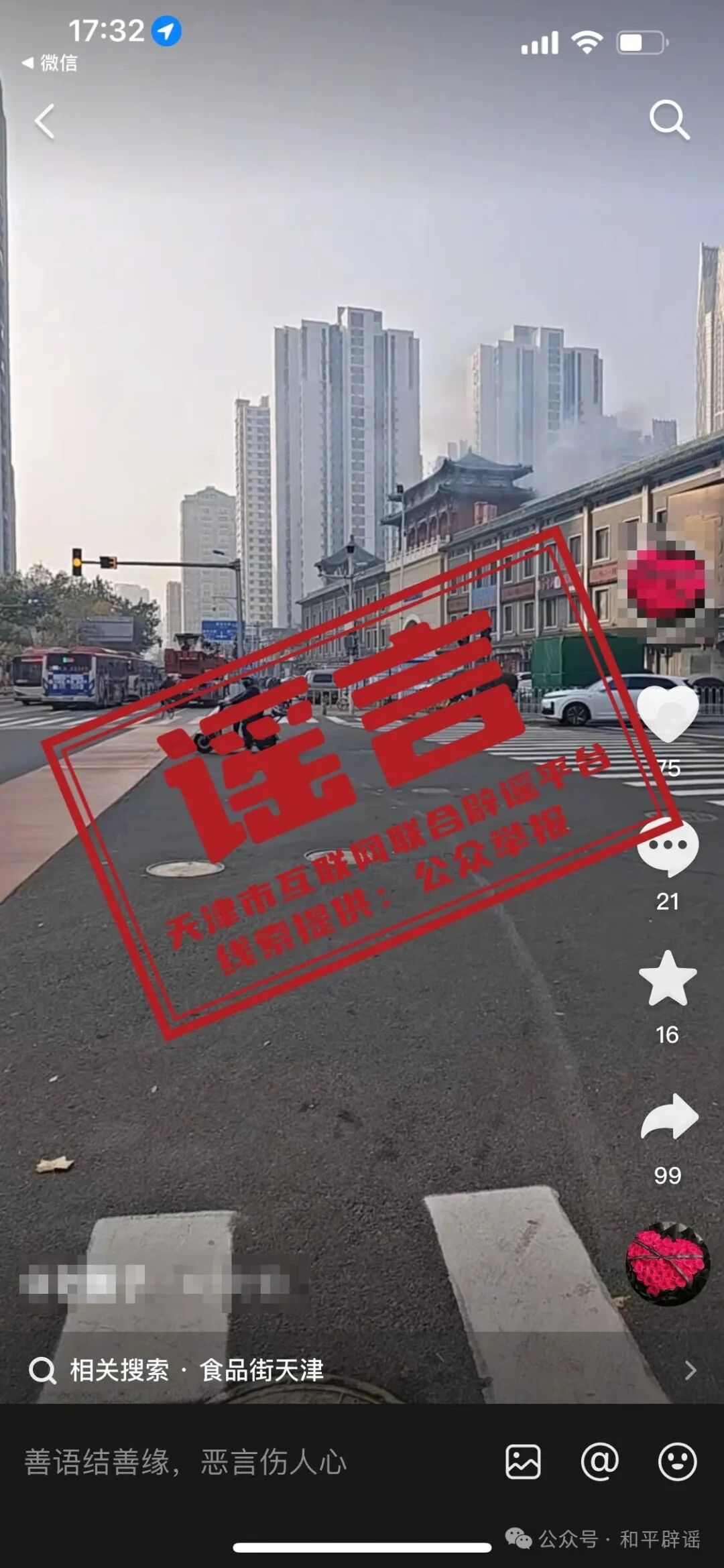 真实情况为:和平区消防救援支队12日上午在南市食品街(和平区慎益大街与荣业大街交汇处)开展消防演练。