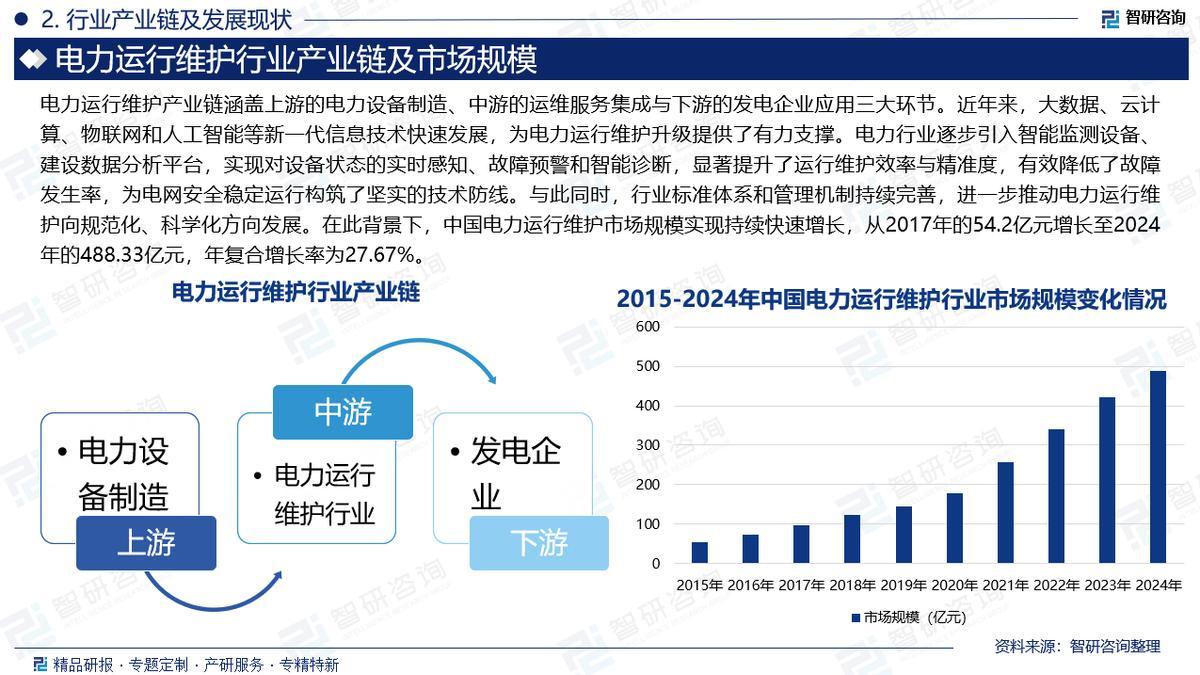 电力运行维护简称电力运维,是通过专业队伍对电力线路、运行设备及供电系统实施全周期管理的系统性活动。其核心在于保障电力系统的安全稳定运行,涵盖设备巡检与检查、设备维护与保养、故障处理与修复、数据监测与分析、安全管理、文档记录与报告、用户支持与沟通等七个维度的工作内容。电力作为国民经济的重要基础设施,其安全稳定运行直接关系到社会正常运转与经济发展。过去,电力运行维护主要依赖人工巡检和经验判断,存在效率低、风险高、信息传递不畅等问题。随着电力系统规模持续扩大和设备复杂程度不断提升,传统运维模式已难以适应现代电网高可靠性、高效率地运行要求,推动行业向智能化、信息化方向转型。近年来,大数据、云计算、物联网和人工智能等新一代信息技术快速发展,为电力运行维护升级提供了有力支撑。电力行业逐步引入智能监测设备、建设数据分析平台,实现对设备状态的实时感知、故障预警和智能诊断,显著提升了运行维护效率与精准度,有效降低了故障发生率,为电网安全稳定运行构筑了坚实的技术防线。与此同时,行业标准体系和管理机制持续完善,进一步推动电力运行维护向规范化、科学化方向发展。在此背景下,中国电力运行维护市场规模实现持续快速增长,从2017年的54.2亿元增长至2024年的488.33亿元,年复合增长率为27.67%。随着科技的不断进步和电力行业的持续发展,电力运行维护的前景十分广阔。未来,电力运行维护将会朝向更加智能化、自动化、可视化的方向发展,实现更加高效、准确的设备监控和维护。当前,中国电力运行维护市场竞争日趋激烈,呈现出传统电力服务企业与新兴技术服务企业共同发展的格局。新兴企业凭借其在智能化监测、大数据分析等领域的创新技术和管理模式优化,市场竞争力持续增强,逐步缩小与根基深厚的老牌企业之间的差距。目前,中国电力运行维护行业代表企业包括广州智光电气股份有限公司、国电南瑞科技股份有限公司、思源电气股份有限公司、陕西运维电力股份有限公司、中国华能集团有限公司、中国华电集团北京能源有限公司、大唐吉林电力检修运维有限公司、国家电力投资集团有限公司、中国长江电力股份有限公司、北京金风慧能技术有限公司、中电建电力运维管理有限公司等。