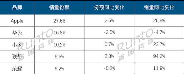 线上销量TOP5品牌榜单正式揭晓,苹果、华为、小米(含红米)、联想、荣耀稳居前列。